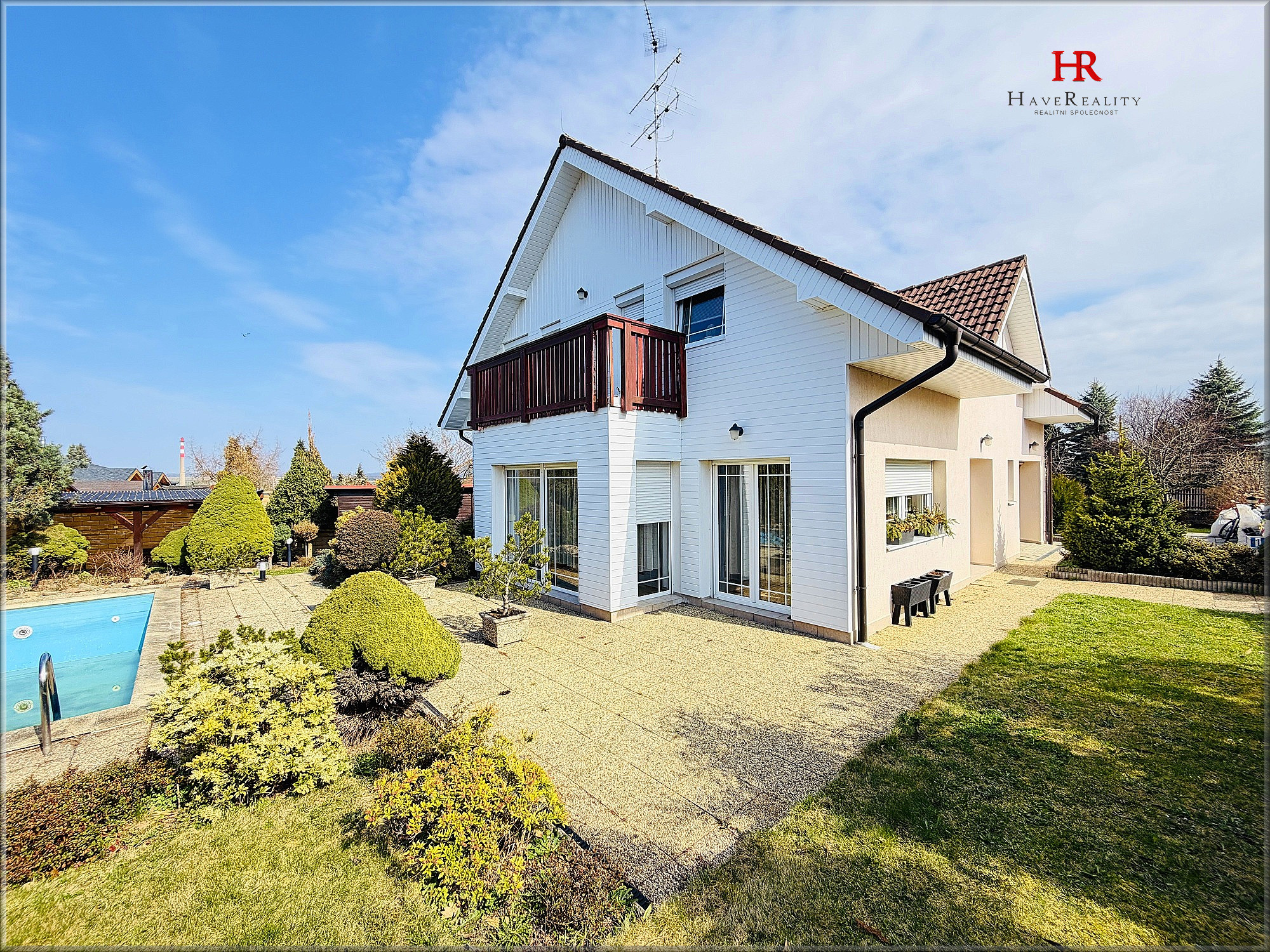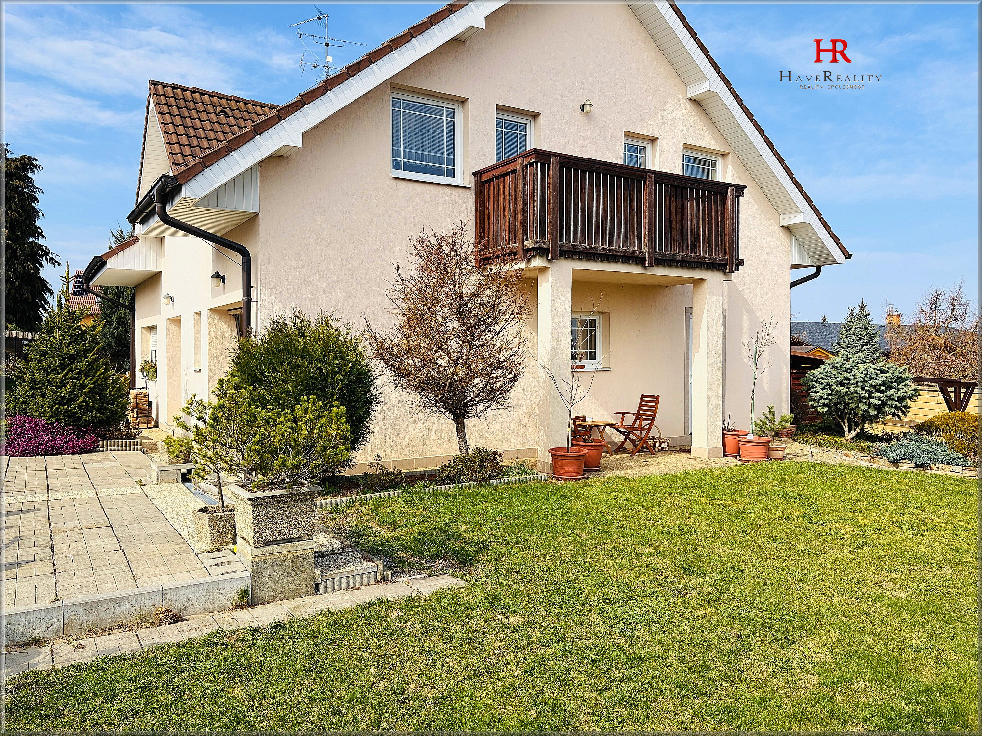 Dispozice domu 6+1 / 2 balkony, 1 terasa, garáž, sklad. Přízemí – obývací pokoj s krbem a vstupem na terasu, kuchyně, spíž, šatna, hala, koupelna se sprchovým koutem, WC a umyvadlem. Garáž, sklad a kotelna – přístupné ze zahrady. Schodiště spojující 1. a 2. podlaží – dřevěné. V obytném podkroví – se nachází 5 pokojů, chodba, šatna a koupelna s vanou, WC a umyvadlem, dále dva balkony (2 x 5 m2) přístupné ze 4 pokojů. PENB – E.